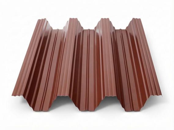 Freigestelltes Produktfoto eines Trapezbleches TP104 in Rotbraun (RAL 8012) mit vier Hochsicken, sattbrauner Oberfläche mit leicht rötlichem Unterton auf weißem Hintergrund.