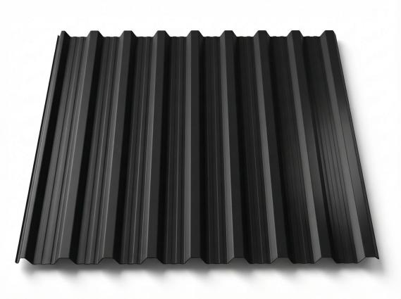 Preview: Das Trapezblech T-18DR wird mit einer 25 µm Polyesterbeschichtung gefertigt. Diese hat den RAL-Ton 9005, was Tiefschwarz entspricht