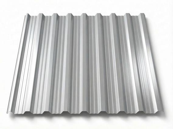 Freigestelltes Trapezblech T18DR in hellem Weißaluminium mit leichtem Silberglanz, glänzende Metallic-Oberfläche mit deutlichen Trapezprofilen und Längsrippen, perspektivische Ansicht auf weißem Hintergrund