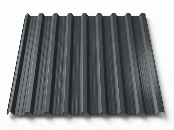 Freigestelltes Trapezblech T18DR in mitteltonigem Graphitgrau, leicht glänzende Oberfläche mit markant ausgeprägten Trapezrippen, perspektivische Produktansicht auf weißem Hintergrund