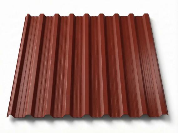 Freigestelltes Trapezblech T18DR in warmem Ziegelrot, gleichmäßig beschichtete Oberfläche mit regelmäßigem Trapezmuster, perspektivische Ansicht auf weißem Hintergrund