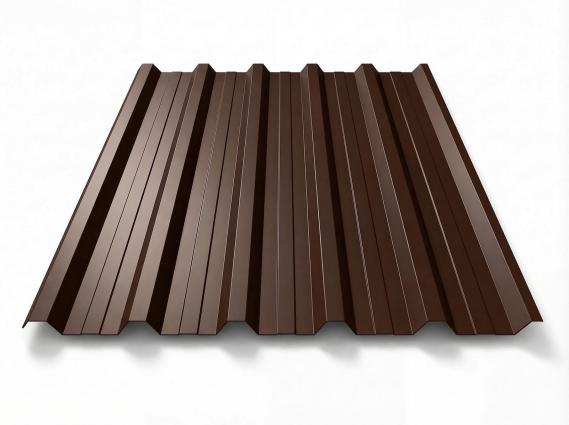 Freigestelltes Trapezblech T-35DR in RAL 8017 Schokoladenbraun, sattes dunkles Braun, perspektivische Draufsicht auf weißem Hintergrund