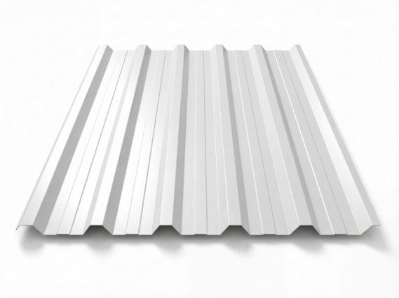 Preview: Freigestelltes Trapezblech T-35DR in RAL 9010 Reinweiß, klares Weiß mit leicht glänzender Oberfläche, perspektivische Draufsicht auf weißem Hintergrund