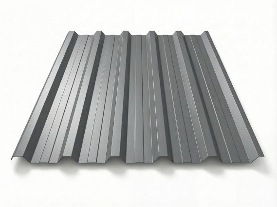 Freigestelltes Trapezblech T-35DR in RAL 7024 Graphitgrau, mitteldunkle silbergraue Beschichtung mit metallischem Glanz, perspektivische Draufsicht auf weißem Hintergrund