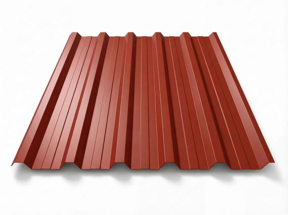 Freigestelltes Trapezblech T-35DR in RAL 8004 Ziegelrot, warme rotbraune Beschichtung, perspektivische Draufsicht auf weißem Hintergrund