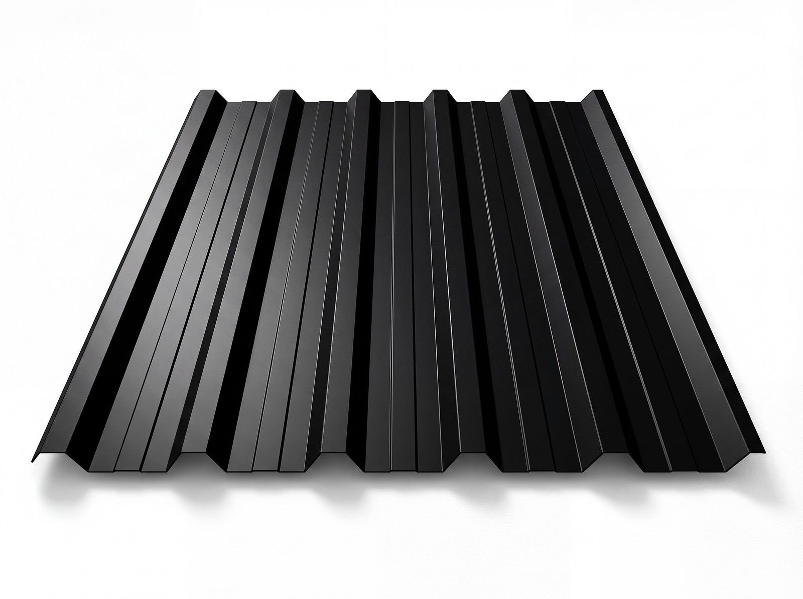 Freigestelltes Trapezblech T-35DR in RAL 9005 Tiefschwarz, mattschwarze Beschichtung, perspektivische Draufsicht auf weißem Hintergrund