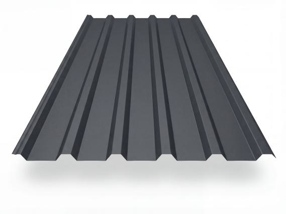 Trapezblech TP35 in Anthrazit (RAL 7016), freigestelltes Produktfoto mit gleichmäßig profilierten Trapezwellen, perspektivische Draufsicht auf weißem Hintergrund