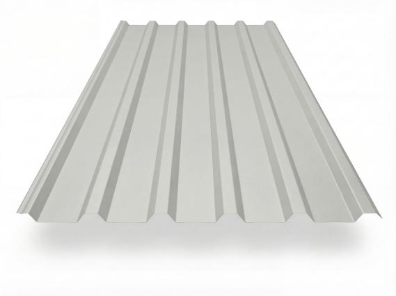 Trapezblech TP35 in Grauweiß (RAL 9002), freigestelltes Produktfoto mit gleichmäßig profilierten Trapezwellen, perspektivische Draufsicht auf weißem Hintergrund