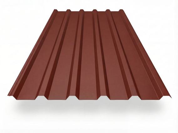 Trapezblech TP35 in Rotbraun (RAL 8012), freigestelltes Produktfoto mit gleichmäßig profilierten Trapezwellen, perspektivische Draufsicht auf weißem Hintergrund