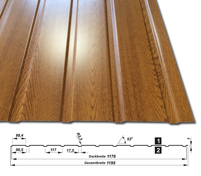 Durch die niedrige Profilhöhe von 7 mm wirkt das Blech dezent und erinnert aus der Ferne stark an echtes Holz. So bekommen Sie die Optik von Holz, aber die Haltbarkeit von Stahl.